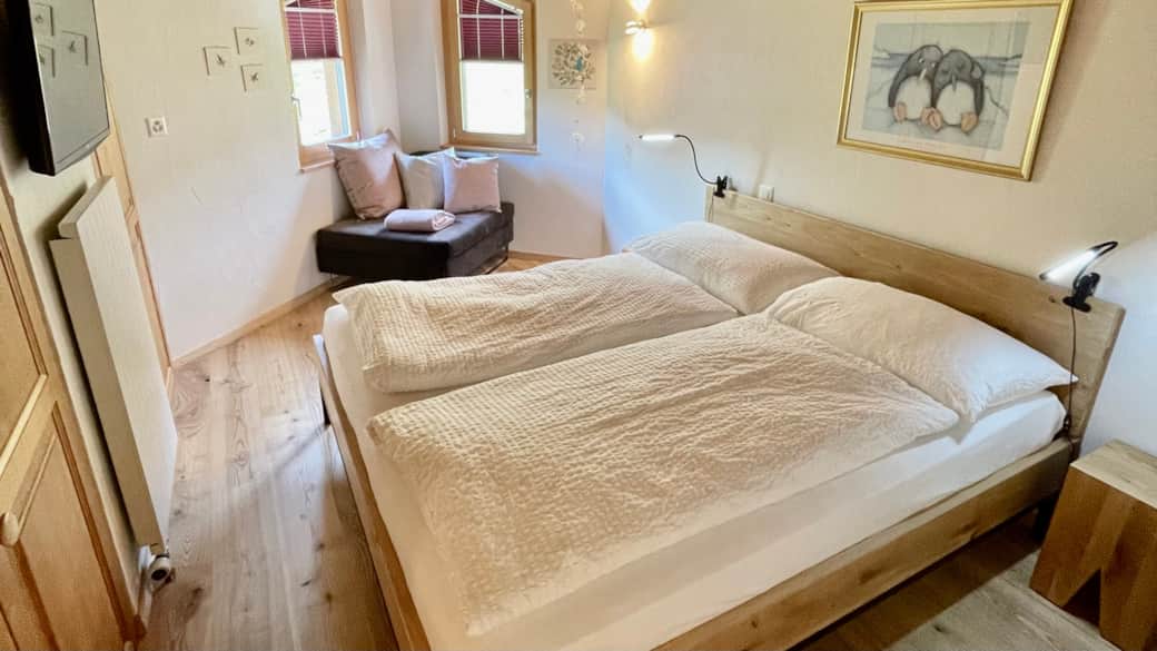 Im separaten Schlafzimmer erwarten dich ein bequemes Doppelbett sowie ein zusätzliches Bettsofa, perfekt für flexible Schlafmöglichkeiten. Ein Kleiderschrank und ein weiterer TV sorgen für zusätzlichen Komfort.