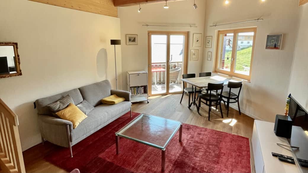 Der neu und komfortabel eingerichtete Wohn- und Essbereich lädt zum Ankommen und Wohlfühlen ein. Ein gemütliches Sofa und Sessel bieten Platz zum Entspannen, während der Esstisch Raum für gemeinsame Mahlzeiten oder Spieleabende schafft. Für Unterhaltung ist ebenfalls gesorgt: TV, Stereoanlage, Radio (DAB), DVD-Player und sogar eine Playstation stehen bereit – ideal für entspannte Abende nach einem aktiven Tag in den Bergen.