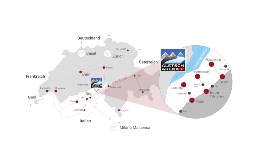 Die Anreise mit öffentlichen Verkehrsmitteln ist besonders komfortabel. Direktverbindungen aus Zürich, Bern, Basel oder Genf nach Brig.